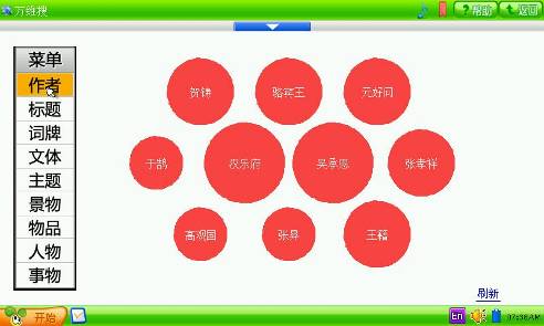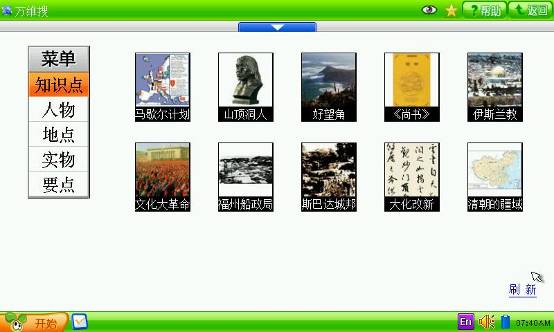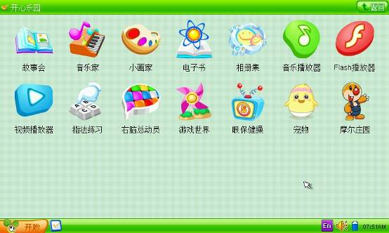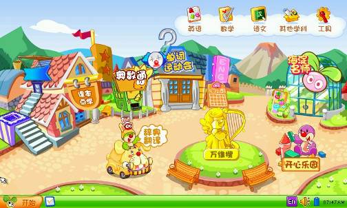 一目了然的卡通风格桌面。依次课本电学、奥术通、单词运动会、海淀名师、辞典翻译、万维搜、开心乐园等特色功能。