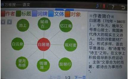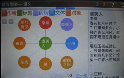 我记得小时候一次参加诗歌朗诵比赛,父亲帮我选了一首《虞美人·春花秋月何时了》,可是现在已经不能完整地背诵下来了,看看这学习机上有没有喽。点击标题,还真有这一首,再点击题目,又出来关于本首词的作者、词牌等拓展学习项目,屏幕右面还有这首词的内容。这种网络学习结构可以从多方面加强巩固学习。