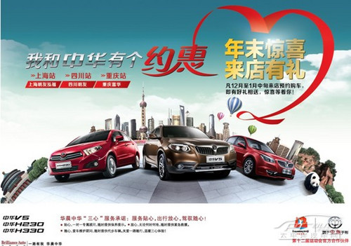 回馈广大车友,华晨中华品牌在2013年岁末的年终特惠活动我和中华有个约惠激情登场,主惠场分别选在上海、成都、重庆。约惠嘉宾:中华V5、中华H230、中华H330