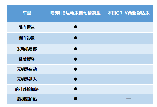 哈弗H6运动版所标配的驻车雷达、倒车影像、陡坡缓降和定速巡航等实用配置,能大幅增加驾驶过程中的便利性,给驾驶者提供一个舒适便捷的用车感受。值得一提的是,哈弗H6还提供有前排座椅加热功能,而带有这个功能的本田CR-V则要23万元以上。