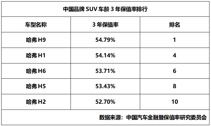 事实上,哈弗就是个很明显的例子,已持续蝉联SUV市场销冠多年,凭真实力成为了中国SUV第一品牌,也是国内市场最具专业实力的SUV品牌。在今年早些时候发布的中国品牌SUV车龄3年保值率前十的排行榜中,哈弗品牌占据了榜单中一半席位,堪称最大赢家。其中哈弗H9以保值率54.79%排名第一,哈弗H1排名第四,哈弗H6排名第六,哈弗H5排名第八,哈弗H2排名第十。