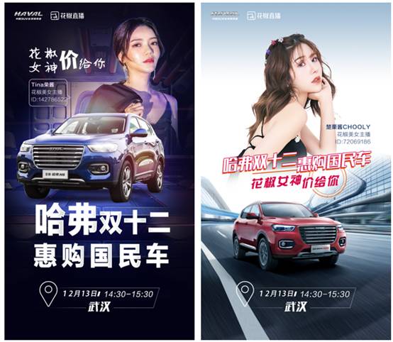 作为中国SUV的“排头兵”,哈弗同样也是多元化营销的大师。2019双12,哈弗顺势行业潮流,将与花椒直播平台合作,联手打造全新哈弗H6年终“花椒女神价给你,哈弗双12,惠购国民车”活动。届时,花椒当红主播Nagisa_sasa酱、Tina荣酱、安安是辣味、歆大小姐等10位主播将现身全国哈弗5家4S门店,以KOL矩阵的形式全面解读国民神车哈弗H6,带领直播间用户体验售前、售中、售后的购车流程。让直播间用户真正了解哈弗H6是如何做到销量即将突破300万台,累计78个月成为SUV销冠军的国民神车。全面解读的同时还会为直播间的用户献上精彩的才艺表演及现场互动。