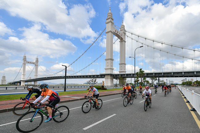 本次骑游大会是“体育+旅游+文化”的完美融合,不仅可以享受速度与激情,还穿越风景名胜,邂逅观音圣地,感受舟山独有的海岛特色、鱼港风情及禅文化氛围。在起终点的舟山体育场,相关配套活动也异常火爆:“勇往直前“儿童滑步车活动、骑行台表演、自行车攀爬表演……一个展示舟山非遗和特色美食的集市也热闹开市:普陀的观音饼、莲花茶,定海的海鲜、石花茶、岱山的鼎和园香干、倭井潭硬膏……受到了选手们的普遍欢迎! 本次骑游大会以 “海岛文化+智慧文化+骑行文化”的结合为核心,通过赛事线路设计、达人故事、舟山人文风情等多维传播,在未来希望可以推动舟山“体育+文化+旅游”产业的复合型发展;开发和推广舟山的海岛民宿、运动健康、海鲜美食、渔家风情、文化旅游、禅修体验等六大相关旅游产品;为选手及家属提供酒店、用餐、用车、旅游等全套优质服务,从而实现舟山“旅游+体育”长期长效发展的溢出效应。 舟山市副市长方维在开幕式上热情介绍舟山:舟山是首个以海洋经济为主题的国家级新区,也是自由贸易试验区。舟山有着“城在海上、海在城中”的独特魅力,共有1390个岛屿,具有融桥梁、港湾、海水、沙滩、滩涂、岛屿为一体的城市风景特色;舟山海洋风光秀丽、气候宜人、环境优美,是我国空气环境质量最好的城市之一,十分适宜开展各种户外运动;舟山有世界四大渔场之一的舟山渔场,有五百多种鱼类、甲壳类、贝类,海鲜美食独具风味。近年来,舟山市依托得天独厚的资源优势,做新做好“运动+休闲”“体育+旅游”文章,持续培育了一批徒步、自行车、帆船、风筝、沙足等“海洋系”体育品牌赛事,推进海洋休闲运动与海岛旅游建设深度融合,实现“体育赋能旅游”的良性发展。