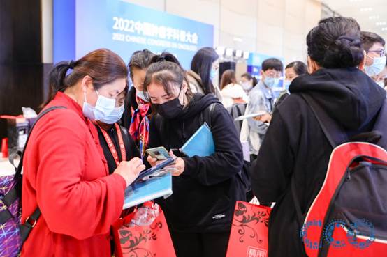 2022中国肿瘤学科普大会主题展前,人们领取肿瘤防治科普书籍