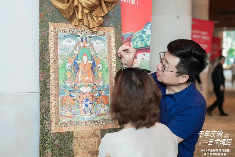上海是一座充满魅力、活力和魔力的国际大都市,世界各地的文化在这里交融、碰撞,为上海注入无限的生机和希望。此次推介会沪藏两地文旅携手共进,共促非遗+旅游融合发展,共画民族文艺同心圆,让“文艺范、民族感、非遗韵”彻底点燃活动现场。独特的民族非遗和绝美的山水景观受到与会嘉宾及媒体的热烈欢迎与重点关注,会上《彩袖舞》、《天上的西藏》、《嘎昌都》、《红旗》等别具民族特色的民族文艺表演让现场嘉宾感受到了浓浓异域风情,体验到藏区康巴文化和传统民俗的文化魅力。嘎玛嘎赤派唐卡非遗传承人嘎玛斯加带来《源远流长的嘎玛嘎赤派唐卡》分享,康勉萨派唐卡非遗传承人仓珠江村带来《指尖上的神韵:康勉萨派唐卡》分享,巴尔玛锤揲法造像非遗传承人嘎玛次仁朗加带来《古老的巴尔玛锤揲法造像技艺》分享,身临其境的沉浸式讲演再次将全场带到千年前那条神秘的历史长河,带进民族艺术的殿堂,获得一致赞扬。