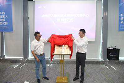 人形机器人创新孵化器总负责人汪兵与漕河新兴技术开发区运营管理有限公司总经晔共同为“上海市人形机器人展示与交易中心”揭牌